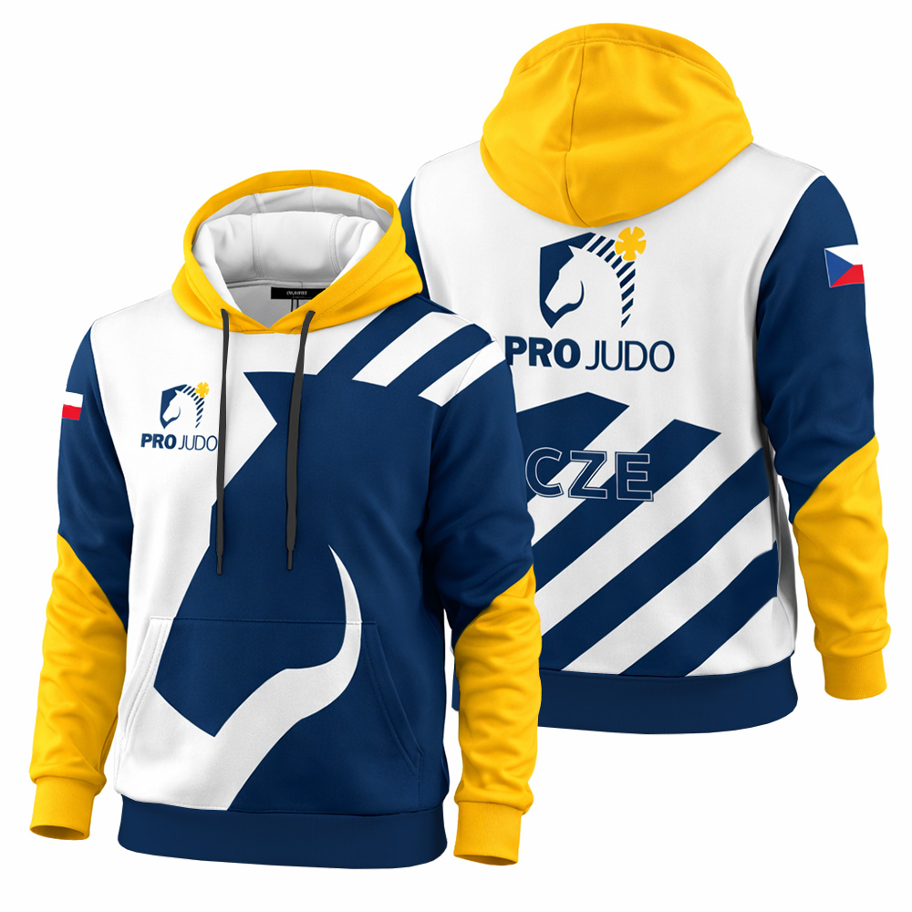 Klubová mikina s kapucí přes hlavu a klokaní kapsou na přední straně a jmenovkou. Technologie barevně stálého sublimačního tisku.